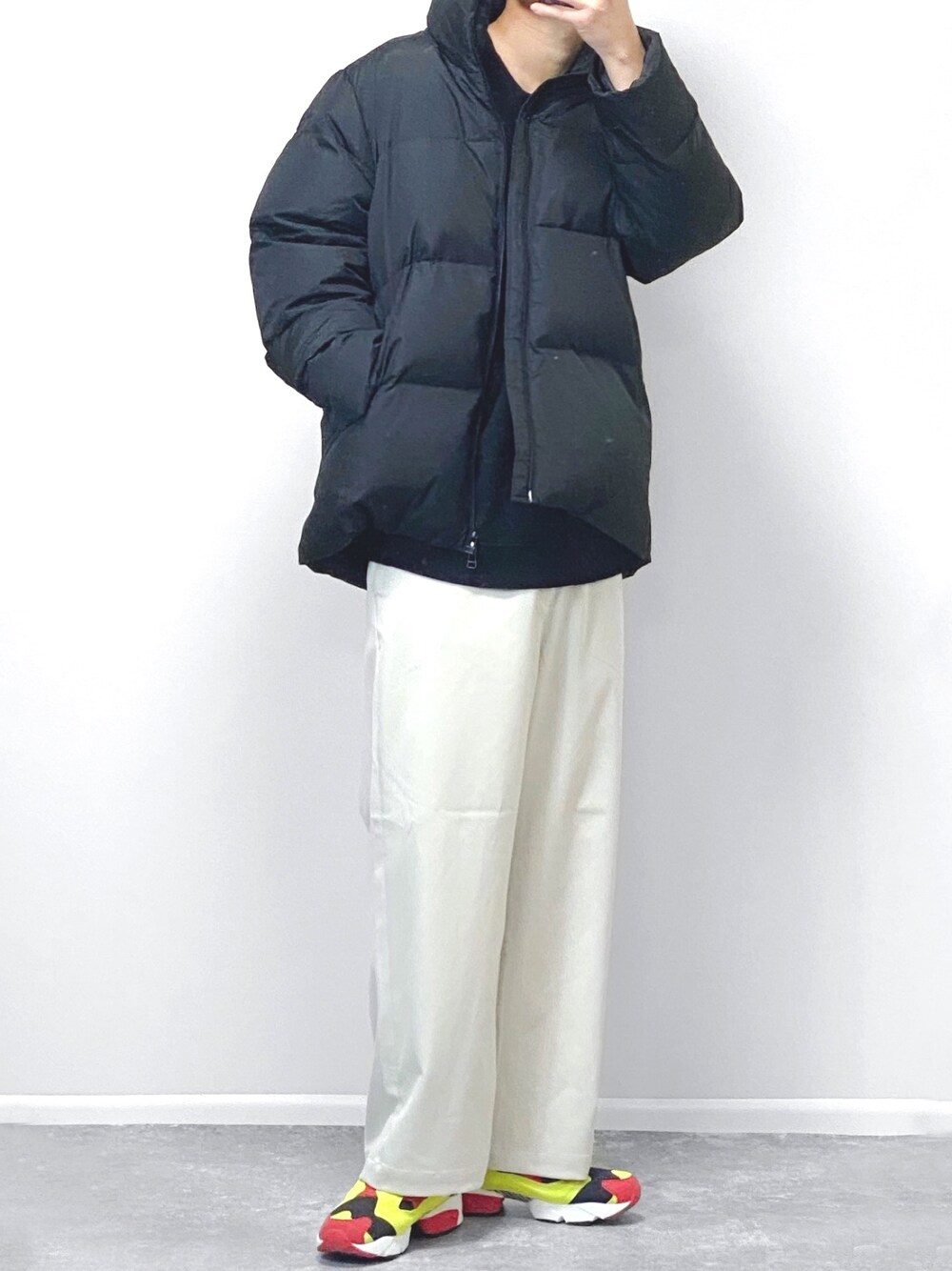 このことから、ハイテクスニーカーを合わせる際は、裾とスニーカーの間に距離を取ることがポイントです。